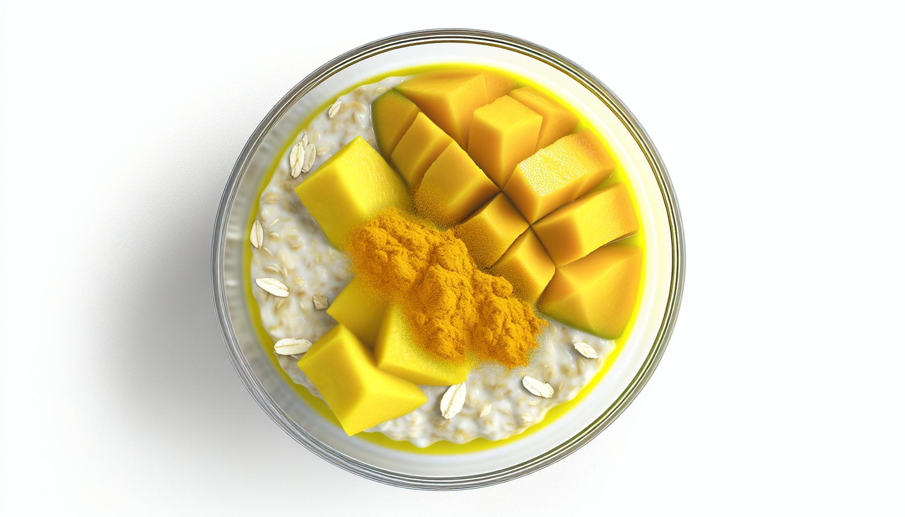 A2: Simply mix rolled oats with milk (or a dairy-free alternative), a teaspoon of turmeric, honey or maple syrup for sweetness, and diced fresh mango. Stir well, cover, and refrigerate overnight. By morning, the oats soften and flavors meld beautifully, ready to enjoy cold or warmed up.